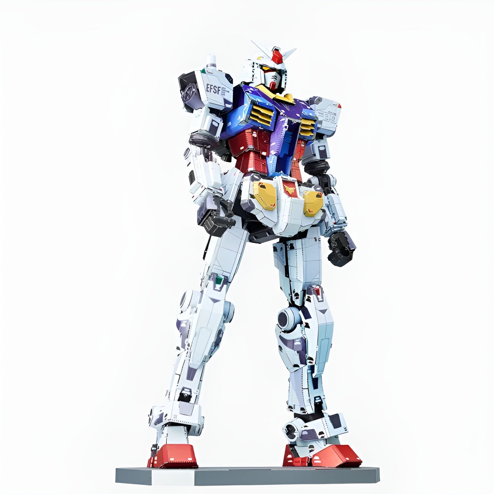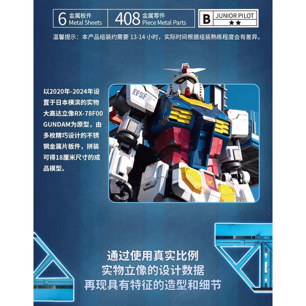 This model kit is based off the life-sized Gundam in Gundam Factory Yokohama. It comes in metal sheets with 408 pieces of metal parts, making it sturdy and solid. This model kit stands at 18CM tall when completed! Side nipper and pliers are required to build this kit, no glue required!
