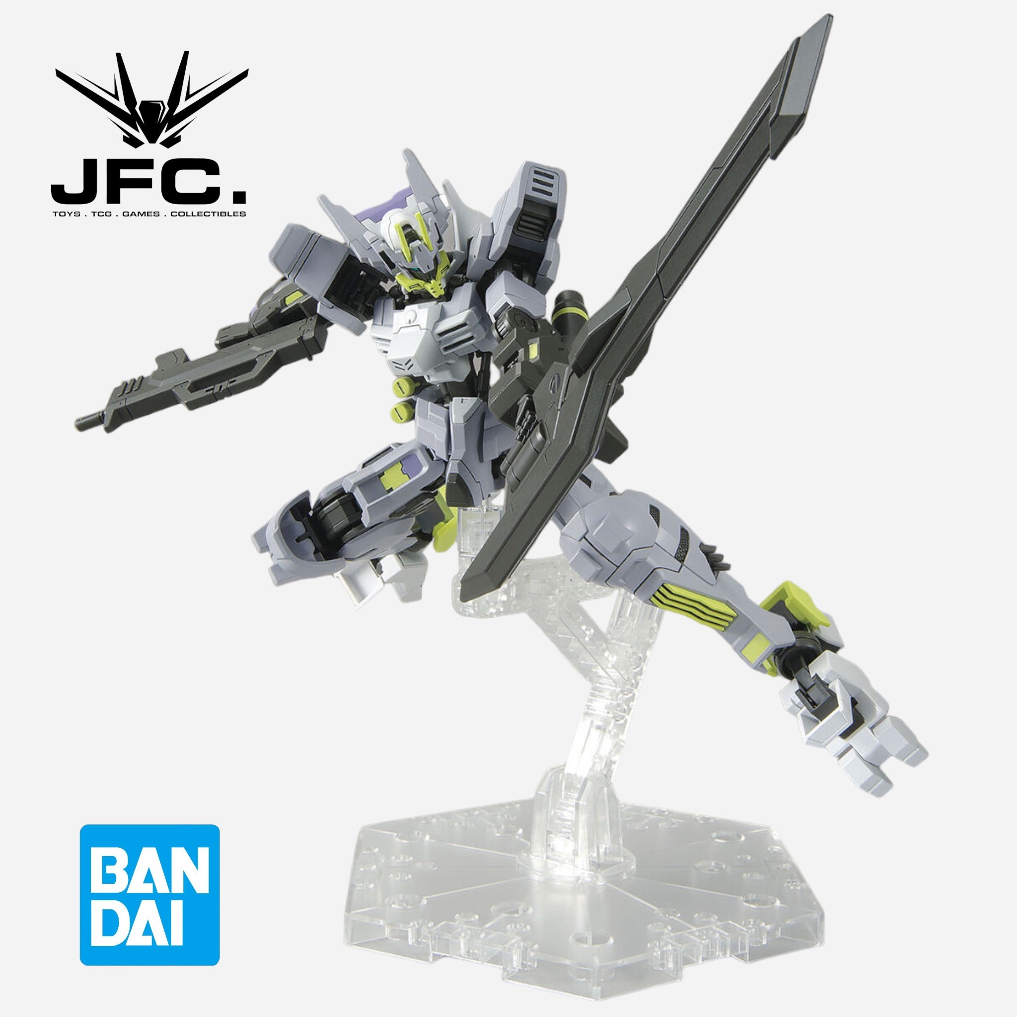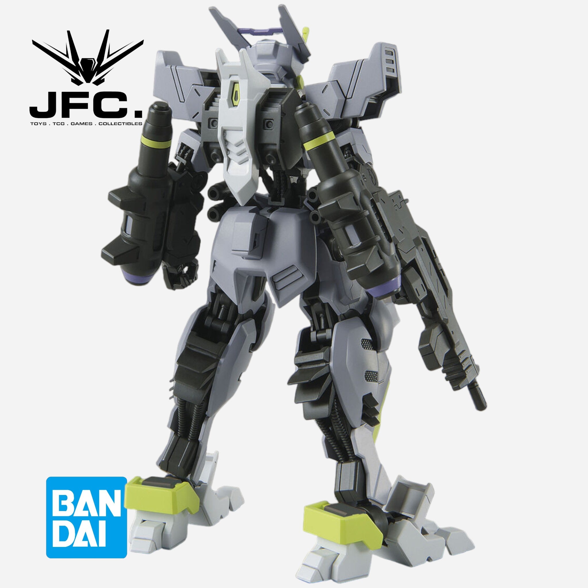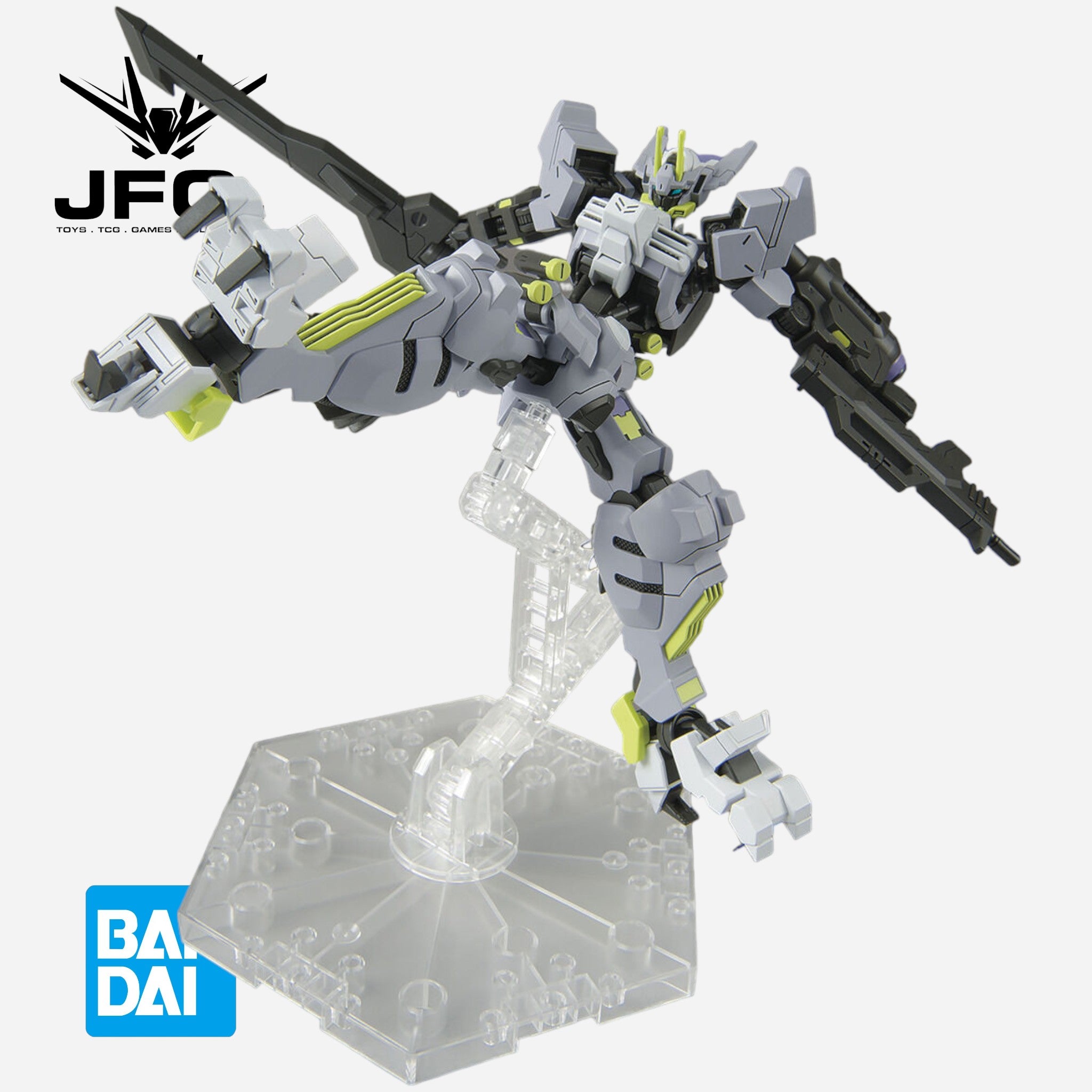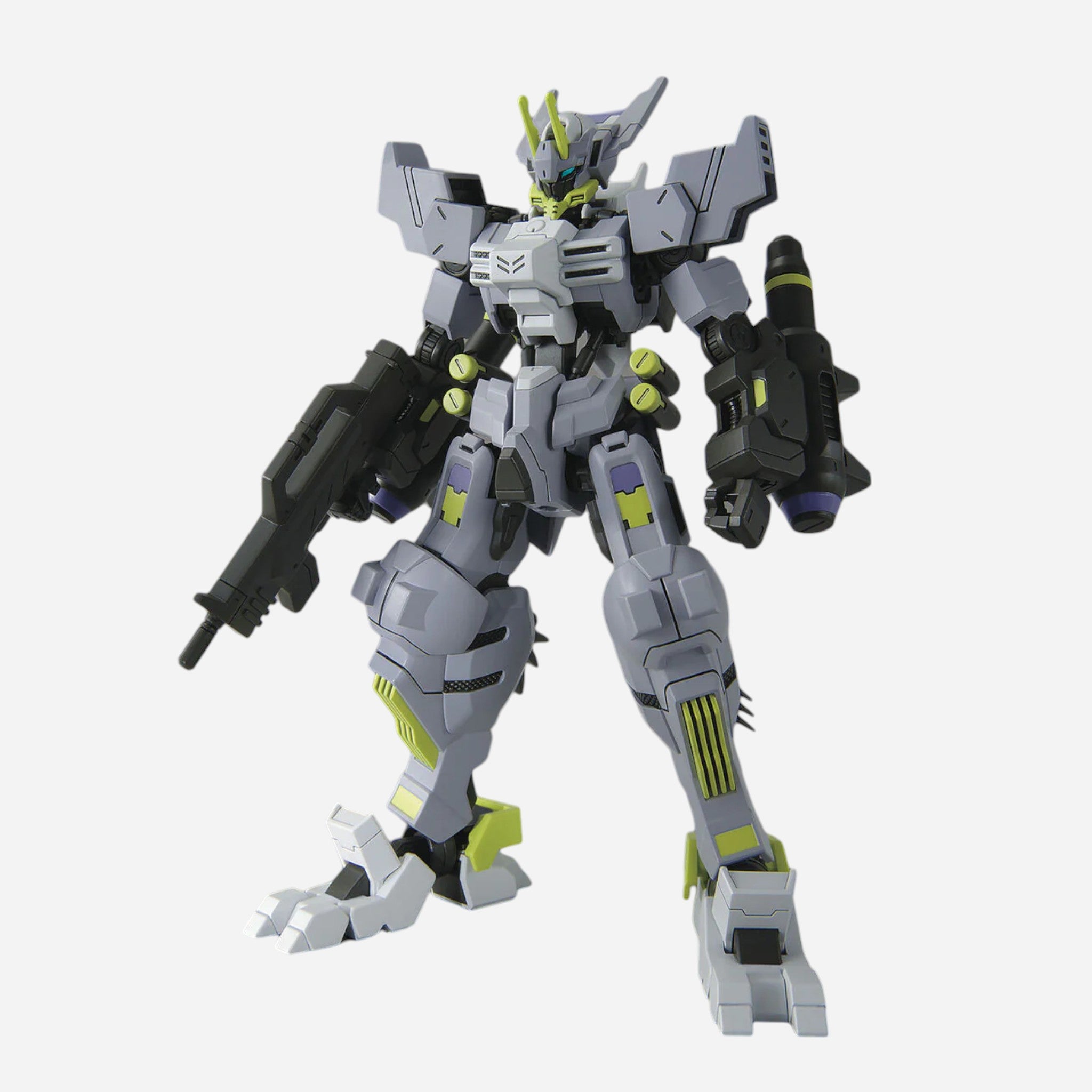 In addition to new exterior parts, its characteristic shape is reproduced by partly new construction of the Gundam frame. The gimmick of the claw on the sole of each foot is expressed?? by parts replacement, as is the expansion and contraction of the Gran Tonfa on its arms. Its Gigant Javelin anchor gimmick uses a lead wire for posability; a rifle can be mounted on its rear skirt and the back thruster is movable.
