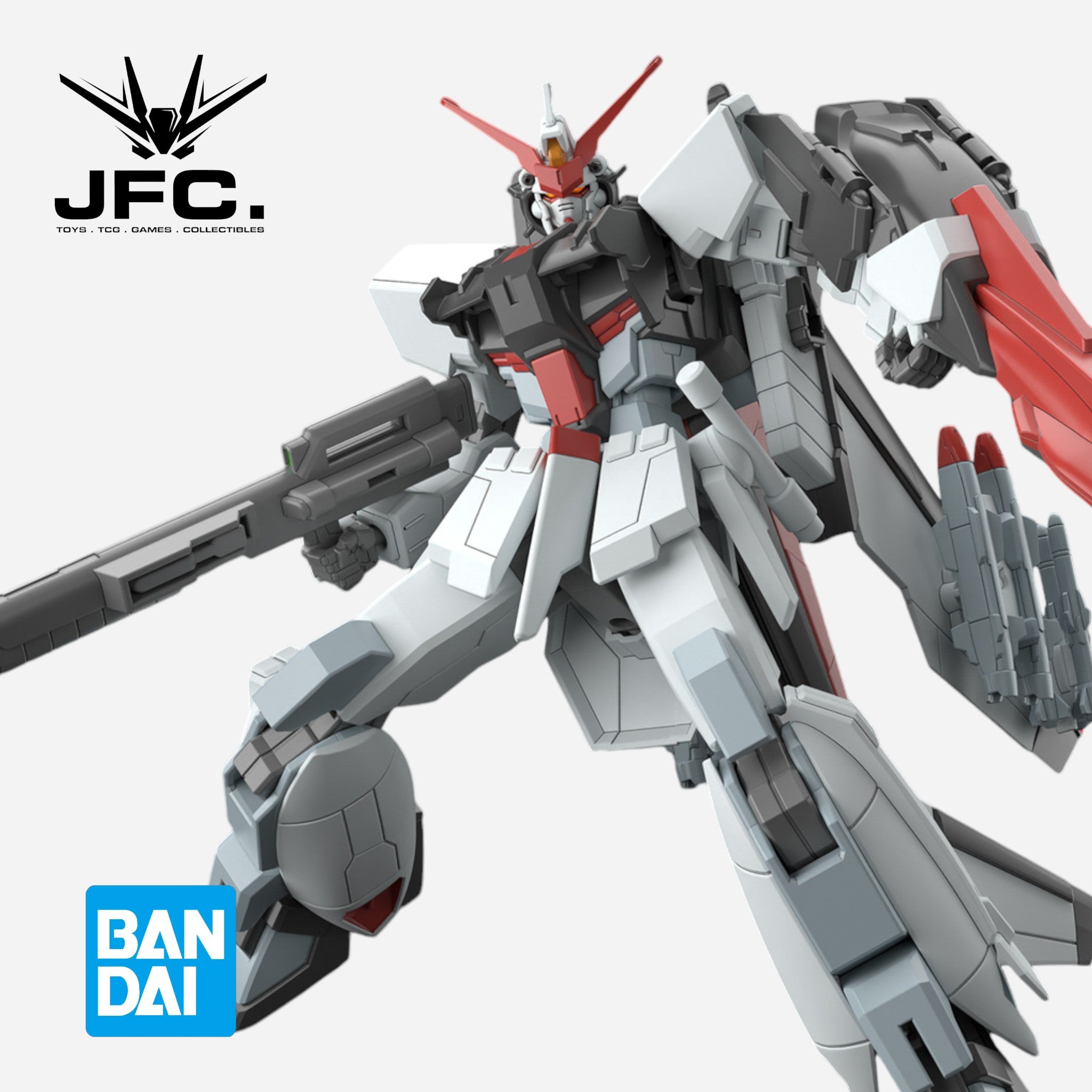 In order to beautifully express the silhouette of the fighter-plane version, the transformation mechanism has been omitted, and the transformation is accomplished with parts replacement. The foregrip of the beam rifle can be stored and deployed; in MA form, the rifle can be connected tot he main wing. The accent colors and the color-coded head are reproduced in detail by dividing the parts. Collect multiples of this mech to reproduce operational actions in formation!
