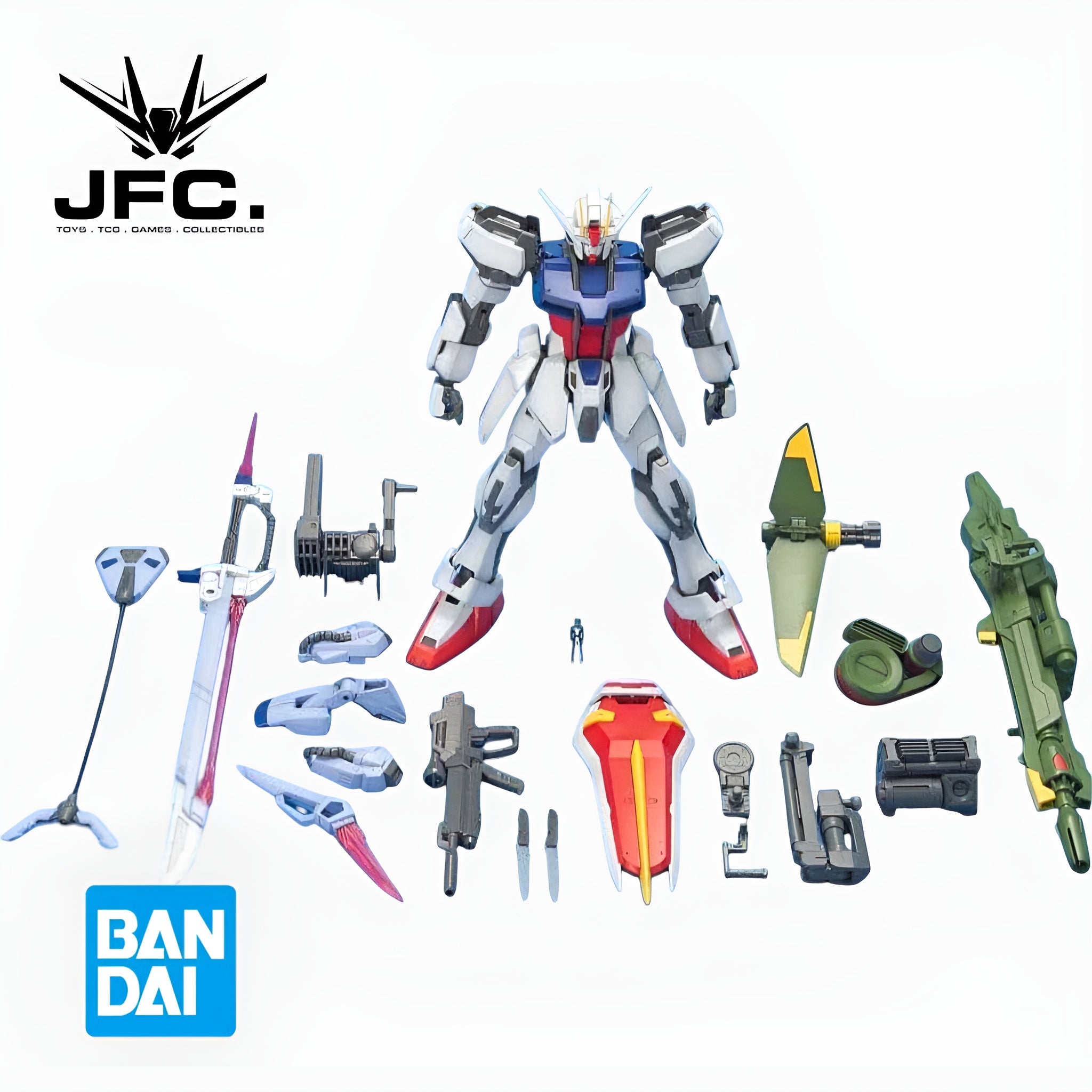 A display stand is provided to assist with dynamic mid-air poses. Foil stickers, dry-transfer decals, and marking stickers are included. The Striker Packs are also compatible with MG Aile Strike Gundam.
