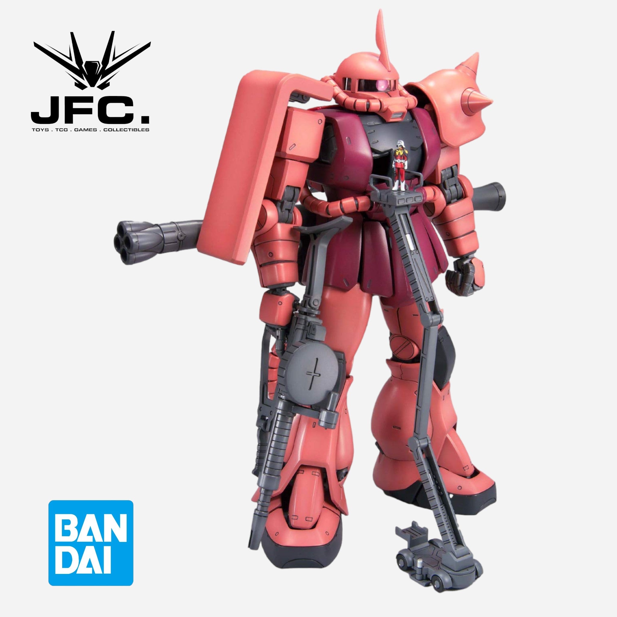 Weapons include a Zaku machine gun, Zaku bazooka, and a heat hawk. Two types of blade antennas are included along with a lift vehicle to bring the included 1/100-scale standing Char Aznable (molded in red) to the cockpit.