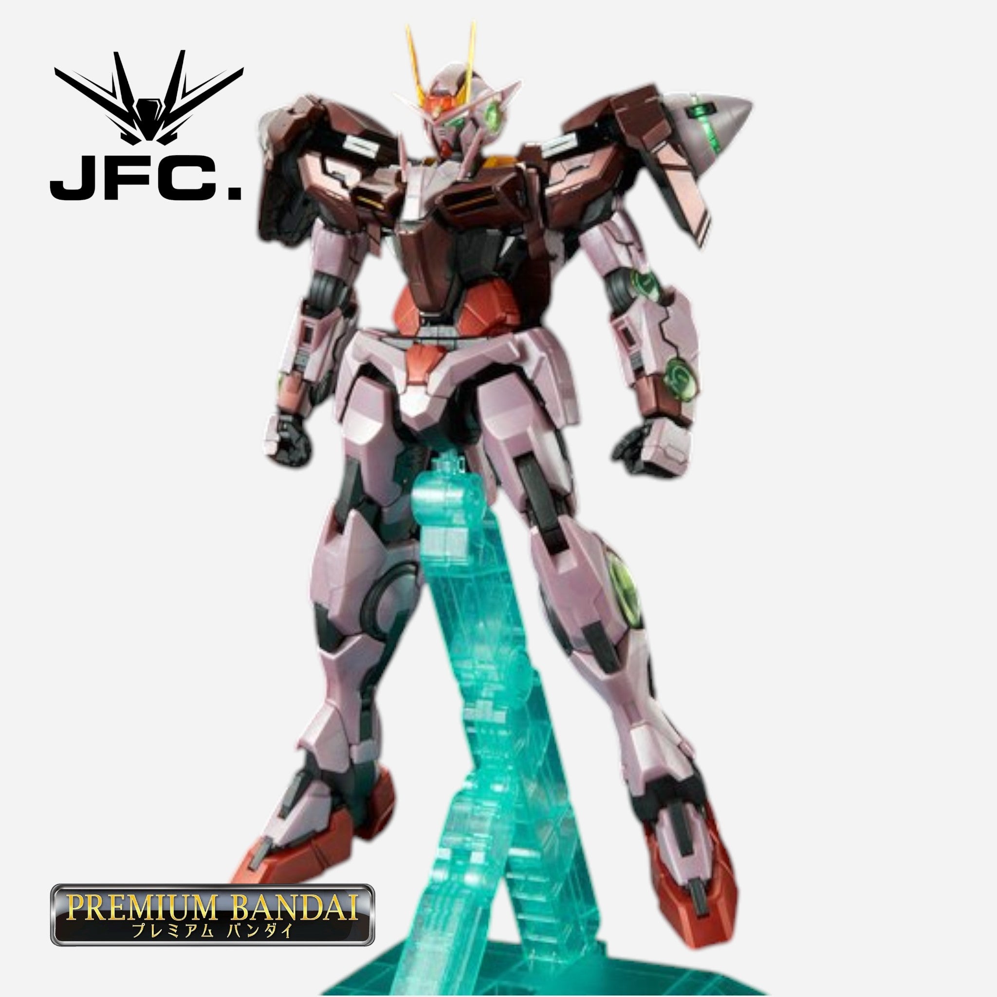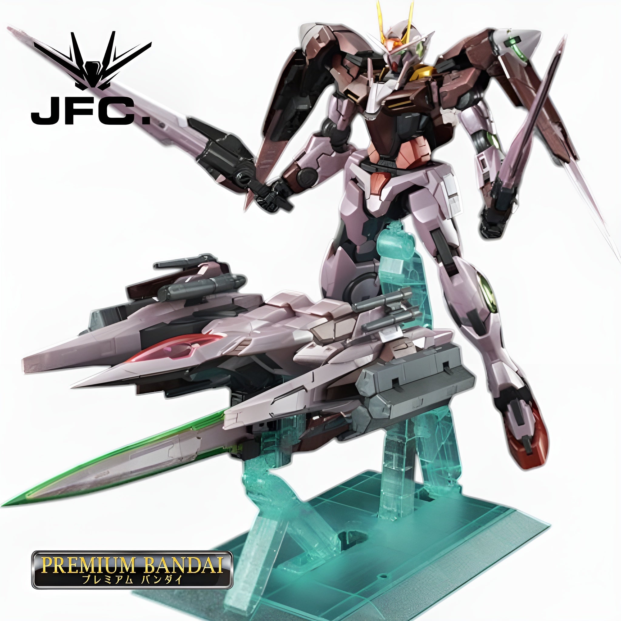 A dedicated stand with a metallic light green finish is provided, enabling stable and dynamic posing of the assembled model. This stand evokes the dispersal of GN particles and can display the 00 Gundam and 0 Raiser separately or in their combined form.