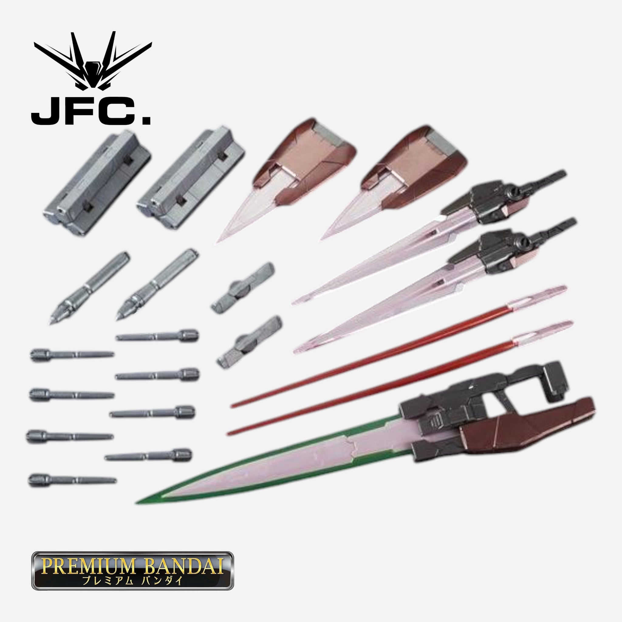 The blade antenna is treated with a matte gold coating, providing a deep metallic texture, while the GN Sword II blades feature a glossy light pink plating to accentuate their sharpness.