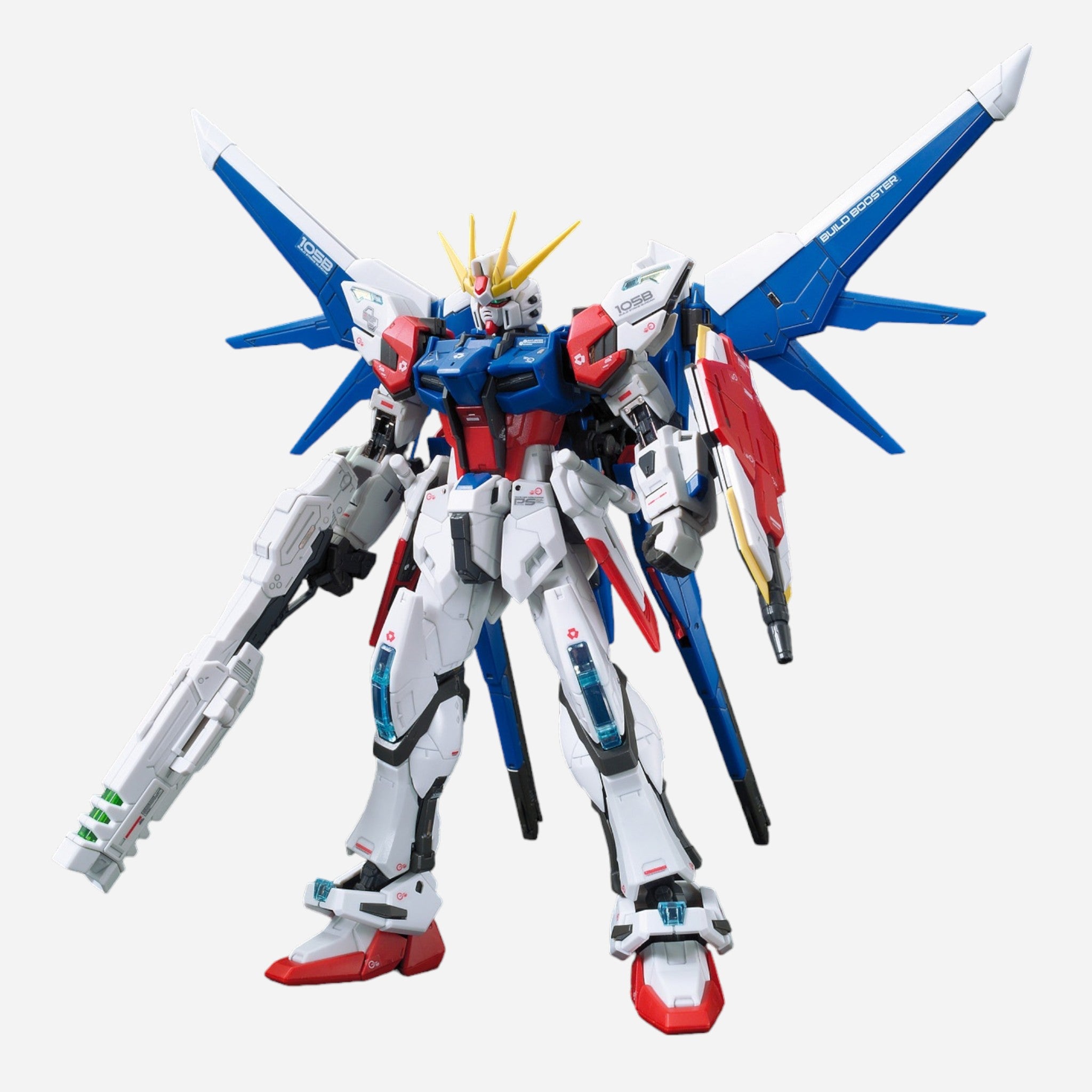 Sei Iori's FP Build Strike Gundam Full Package gets a Real Grade release from Bandai, complete with a variety of weapons--the Build Booster, beam rifle, beam gun (combinable with the beam rifle), two beam sabers, and shield. It also comes with extra hands to hold the weapons.