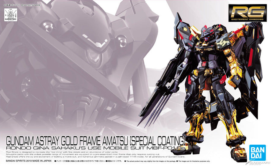 This Real Grade kit brings the iconic Astray Gold Frame Amatsu Mina from Gundam SEED Astray into Bandai’s RG 1/144 line with stunning precision! The Special Coating finish gives the armor a striking gloss and vibrant highlights, reflecting the mobile suit’s stealthy and elegant design.